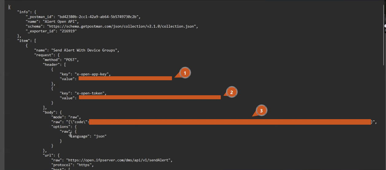 - In the first item, "header" section, note the value for the x-open-app-key ("1" in the screenshot above) and the value for the x-open-token ("2" in the screenshot above).
